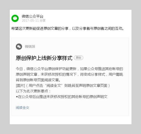 根據(jù)微信官方賬號(hào)消息,原創(chuàng)保護(hù)目前上線新分享樣式,如果公眾號(hào)推送其他帳號(hào)的原創(chuàng)聲明文章,未獲修改授權(quán)的情況下,將變成分享樣式,用戶需跳轉(zhuǎn)到原創(chuàng)帳號(hào)頁(yè)面閱讀文章。
