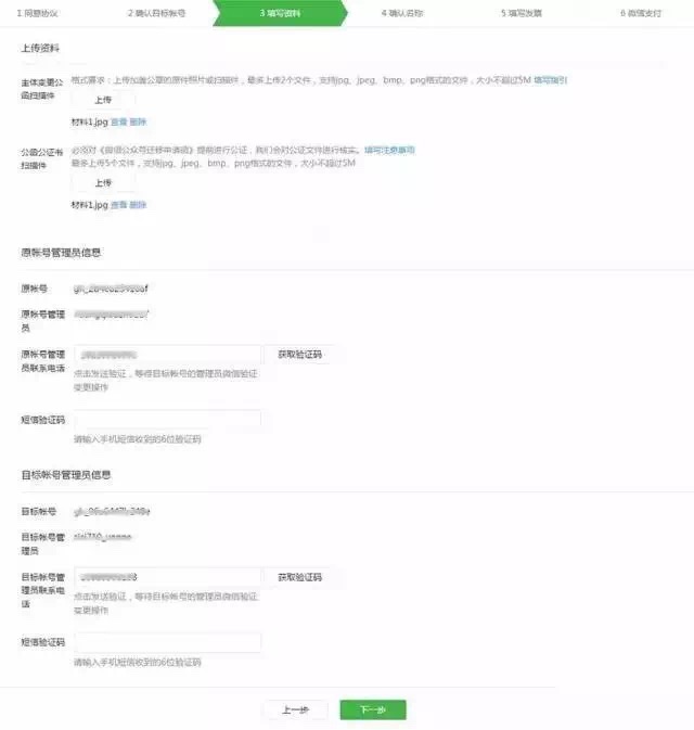 3、填寫申請資料;填寫:原管理員和目標管理員帳號上傳資料:《微信公眾帳號遷移申請函》,《公函公證書》格式要求:上傳加蓋企業(yè)公章的原件照片或掃描件,僅支持5M以內(nèi),jpg .bmp .png格式;
