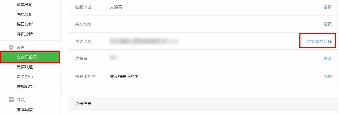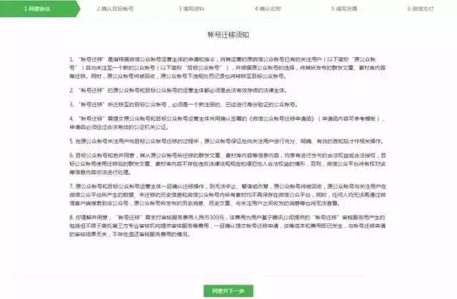二、帳號遷移步驟微信官方給出了非常詳細的操作步驟指引,基本上只要滿足了條件,準備好材料,想好公眾號名稱,準備好費用,就是按部就班的填寫各種表格就可以了,詳細步驟見下文(來自官方):第一階段:入口:公眾號設置->主體信息->帳號遷移,點擊“開始遷移”進入。