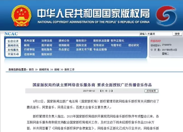 國家版權(quán)局約談幾大網(wǎng)絡音樂服務商 要求全面授權(quán)